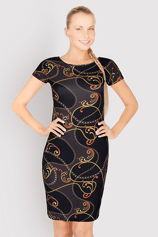 Tmavohnedé krátke letné šaty so zlatkastými retiazkami