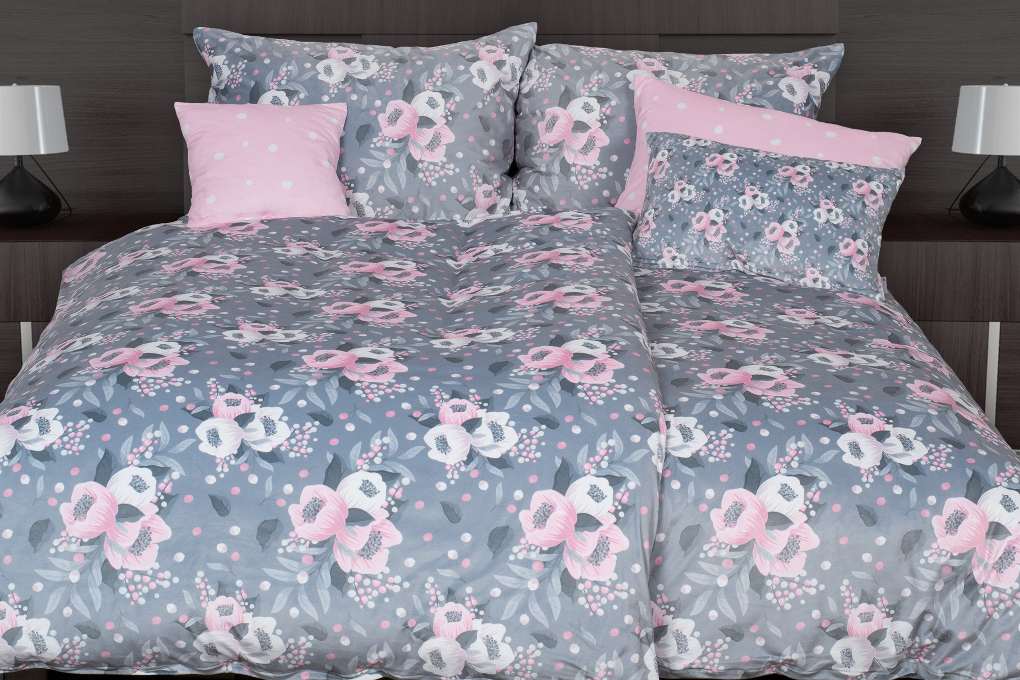 Jemný sivý podklad obliečok zdobia ružové kvietky a bodky.