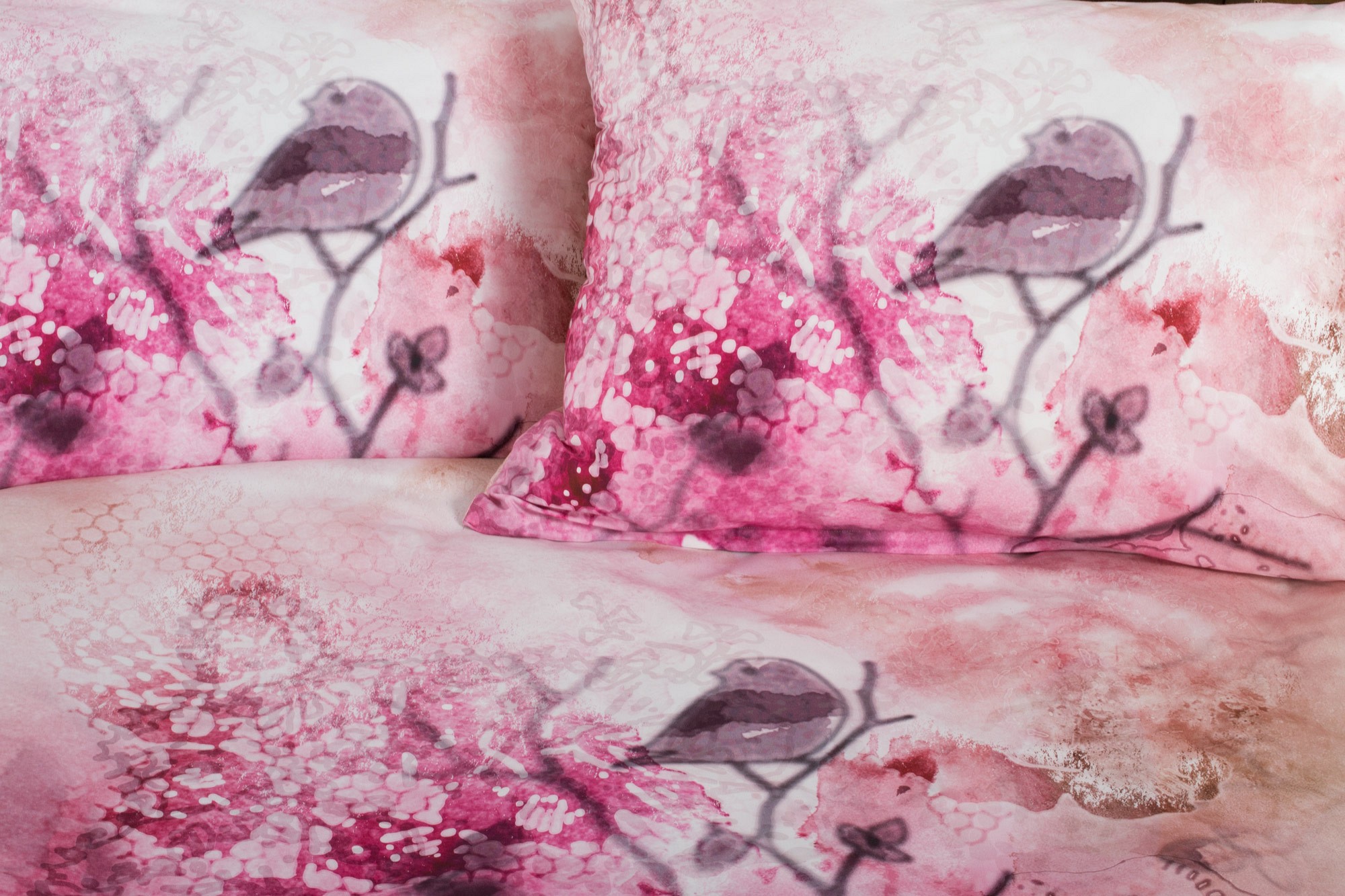 Ružovo fialové romantické obliečky s vtáčikmi.