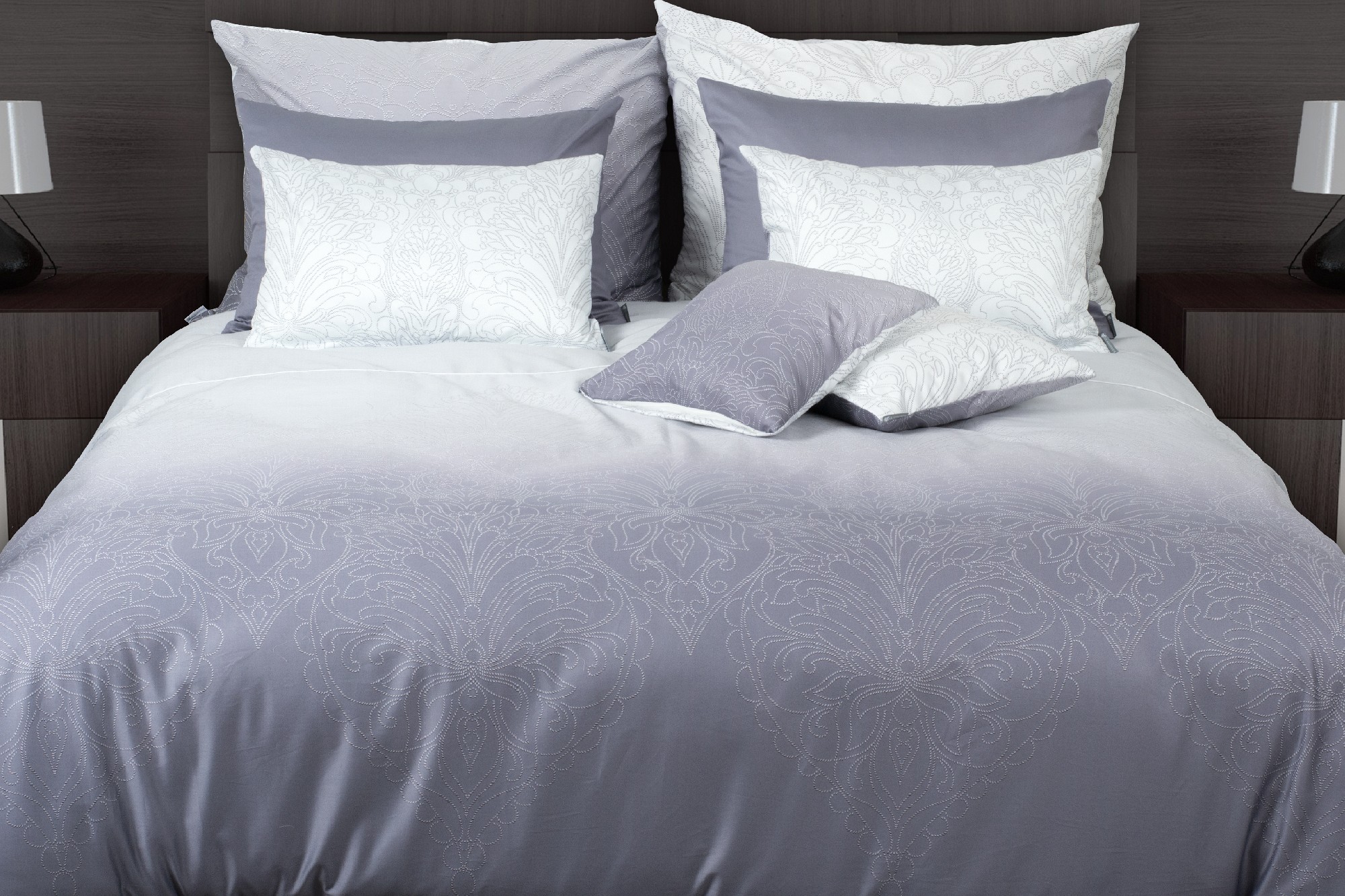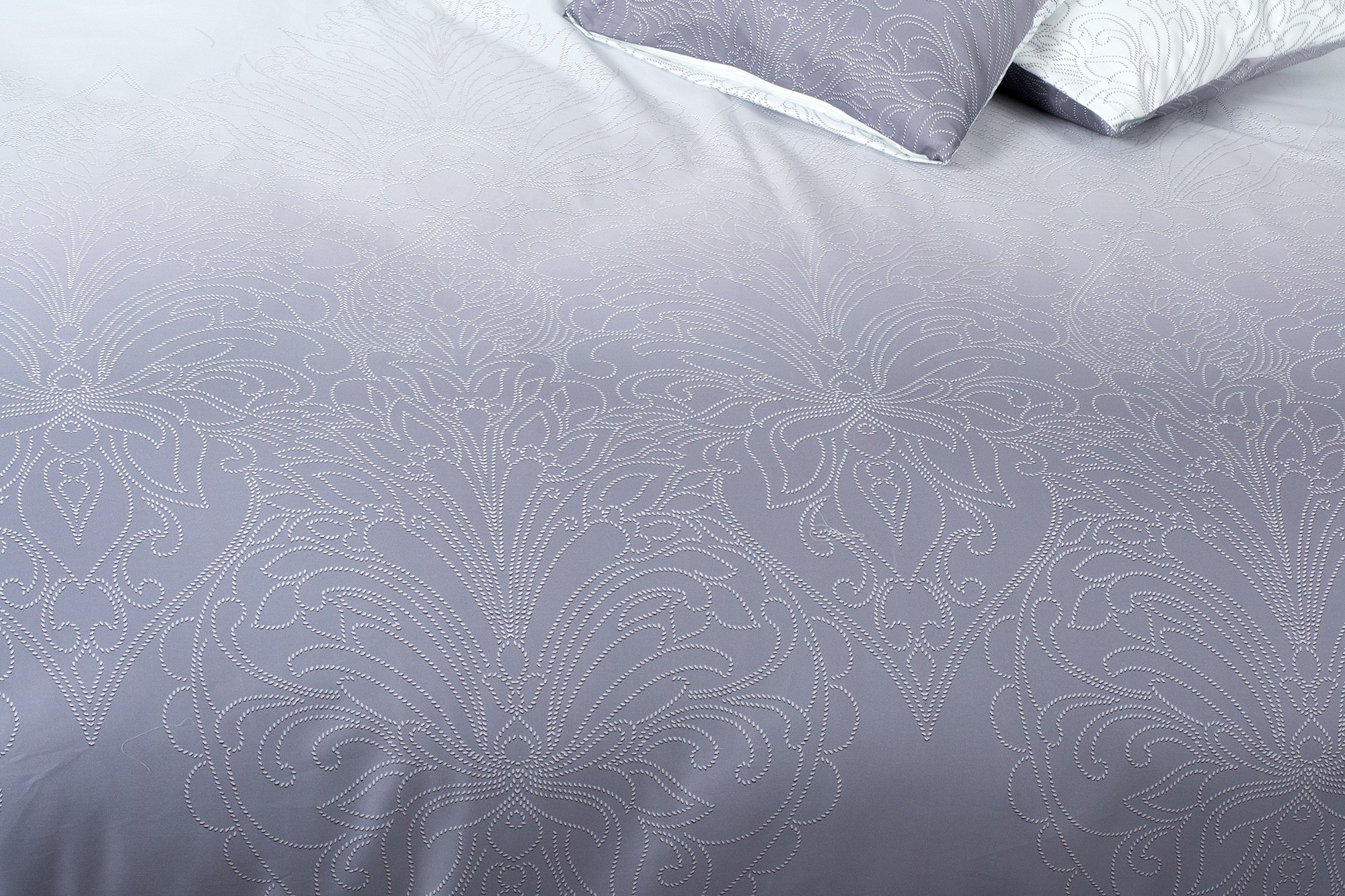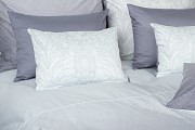 Elegantné obliečky s decentným kvetovaným ornamentom natlačeným v kombinácii prednej šedofialovej a zadnej bielej strany.