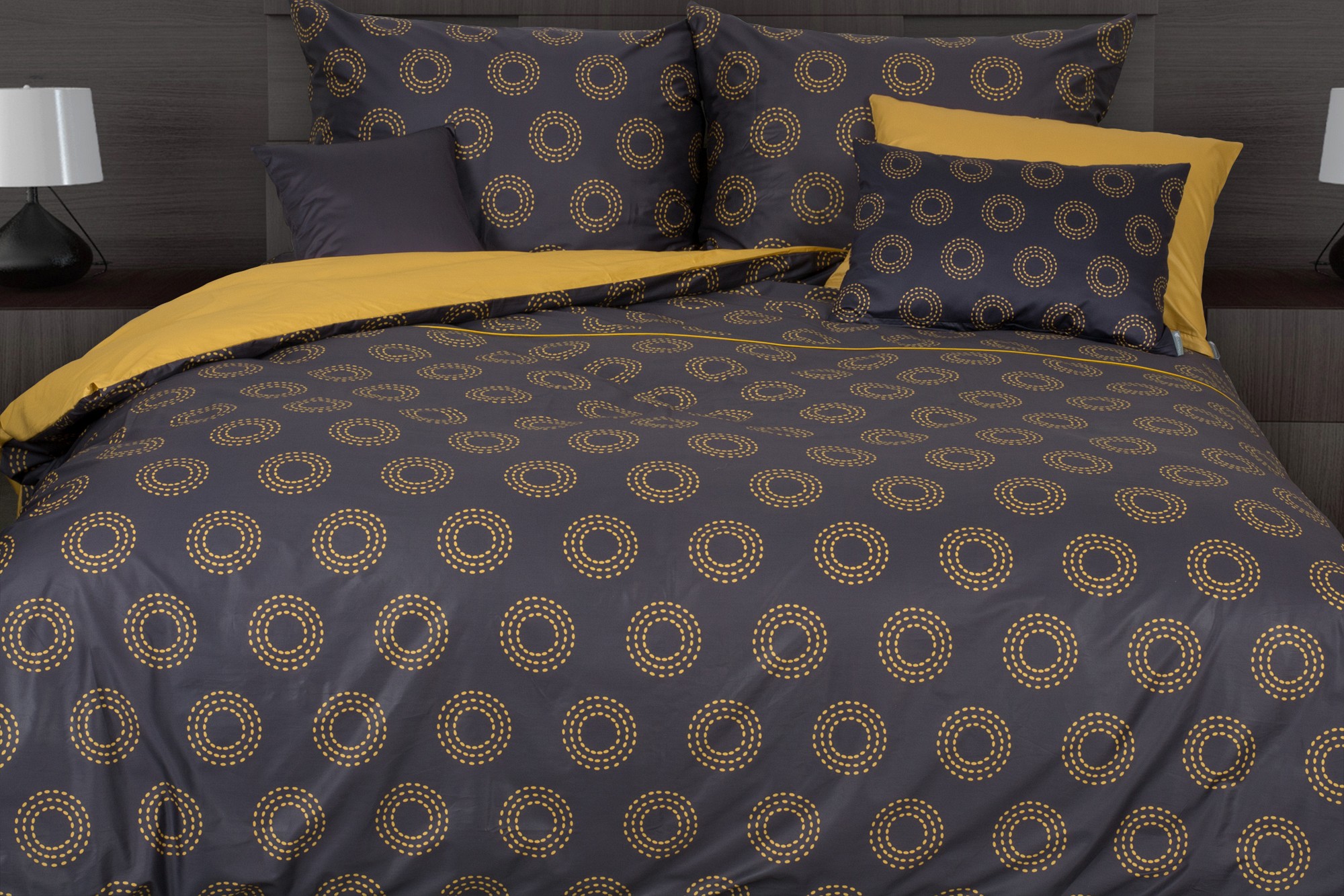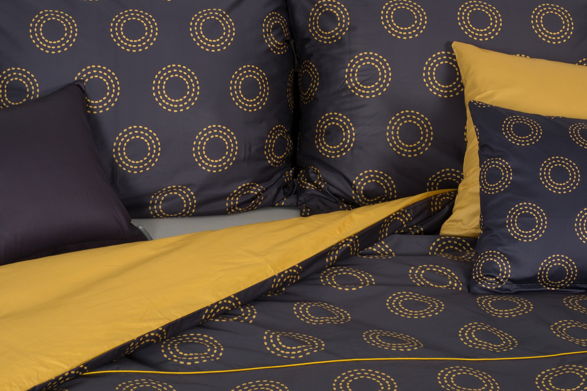 Pri týchto obojstranných obliečkach hrá hlavnú rolu žltooranžová farba vyžarujúca energiu a tmavošedá ju pekne dopĺňa.