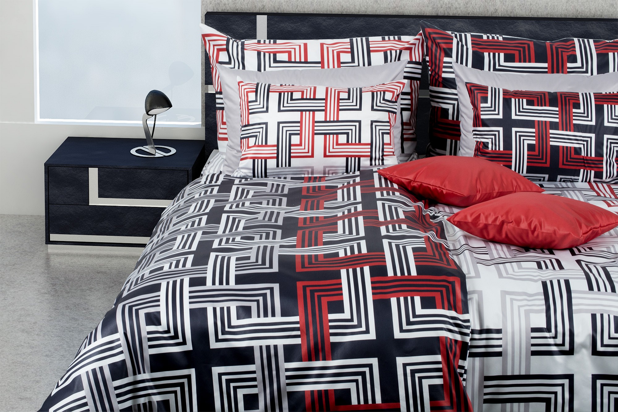 Na čiernobielych obliečkach sú v geometrických radoch a stĺpcoch previazané čiernobiele a červené štvorce.