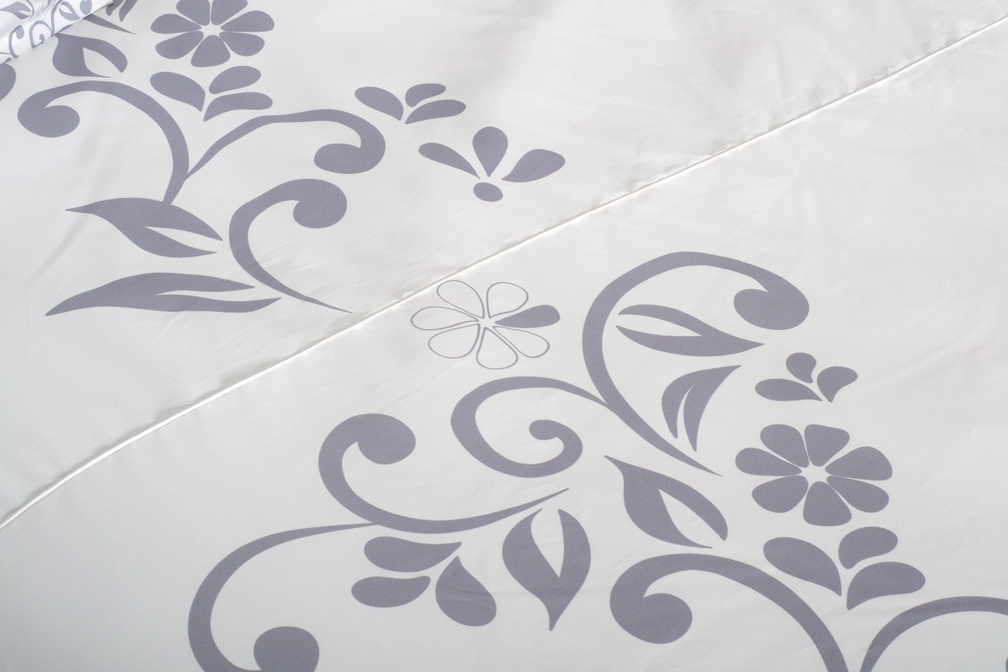 Zadná strana obliečok v neutrálnej svetlošedej farbe je doplnená kvetinovým ornamentom na bielom podklade.