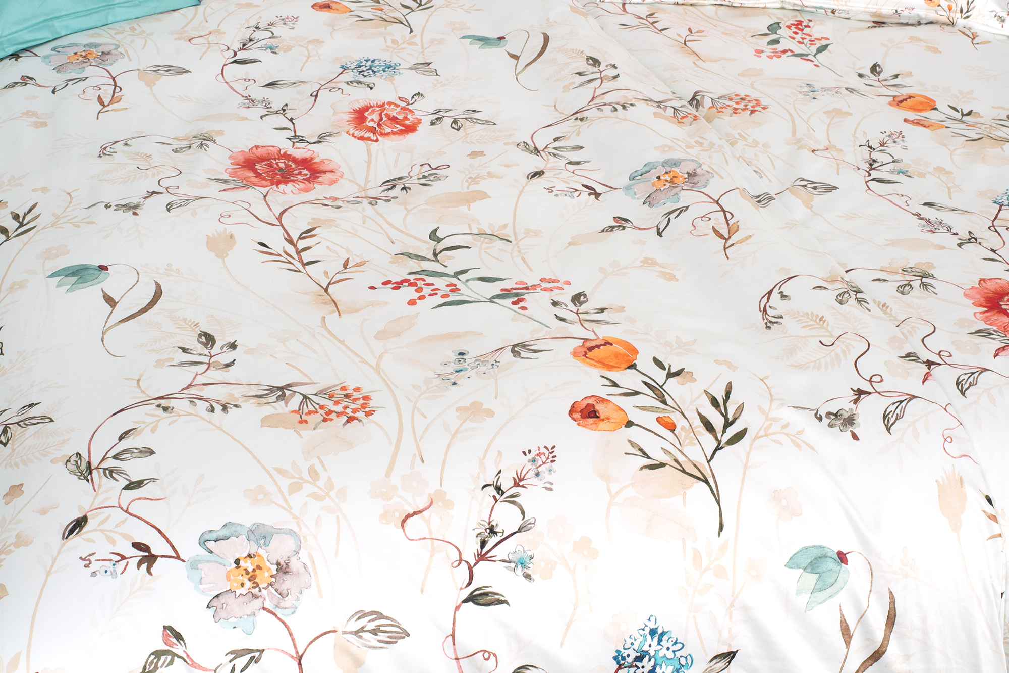 Jemný podklad obliečok zdobí romantický vzor s realisticky vykreslenými kvietkami.