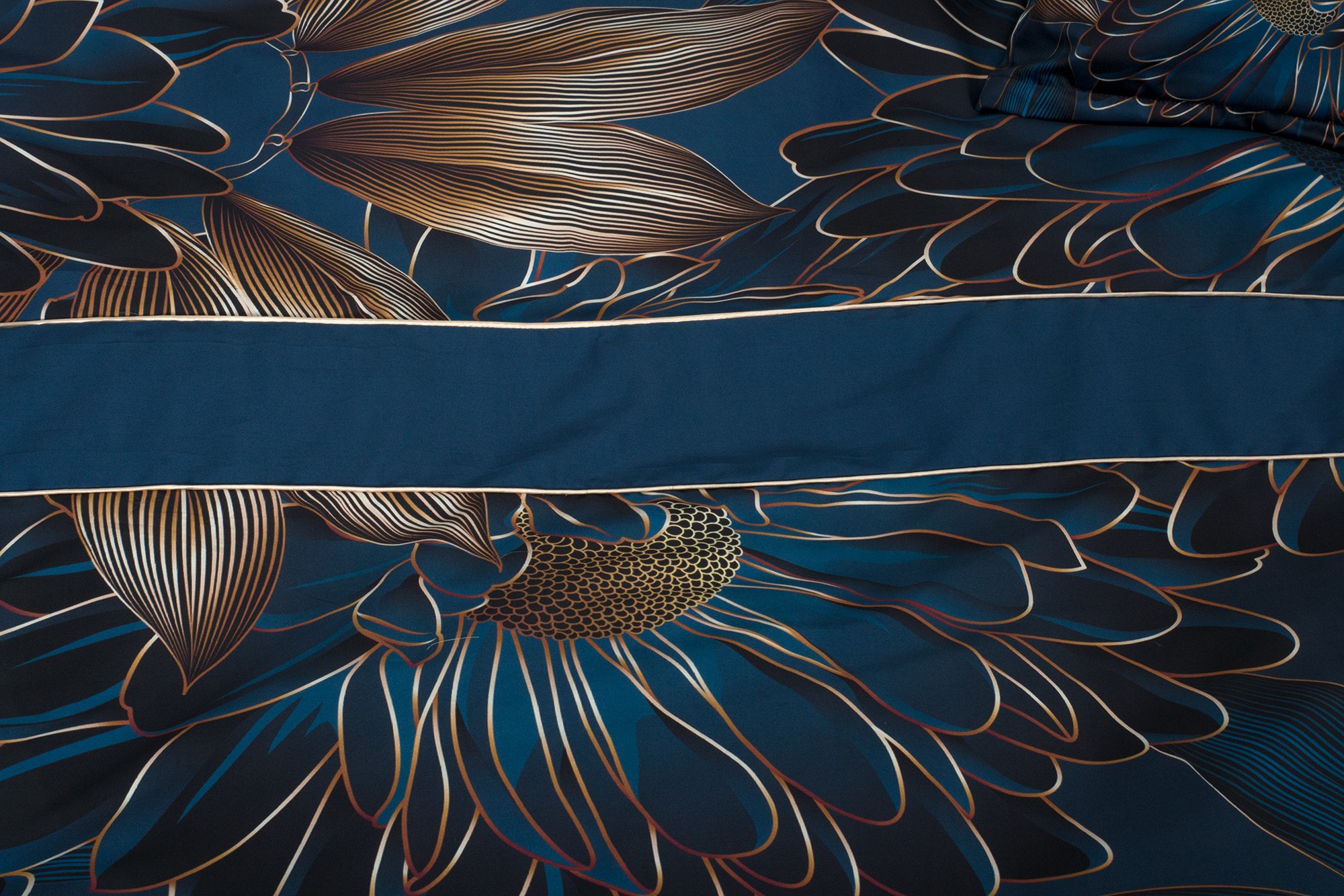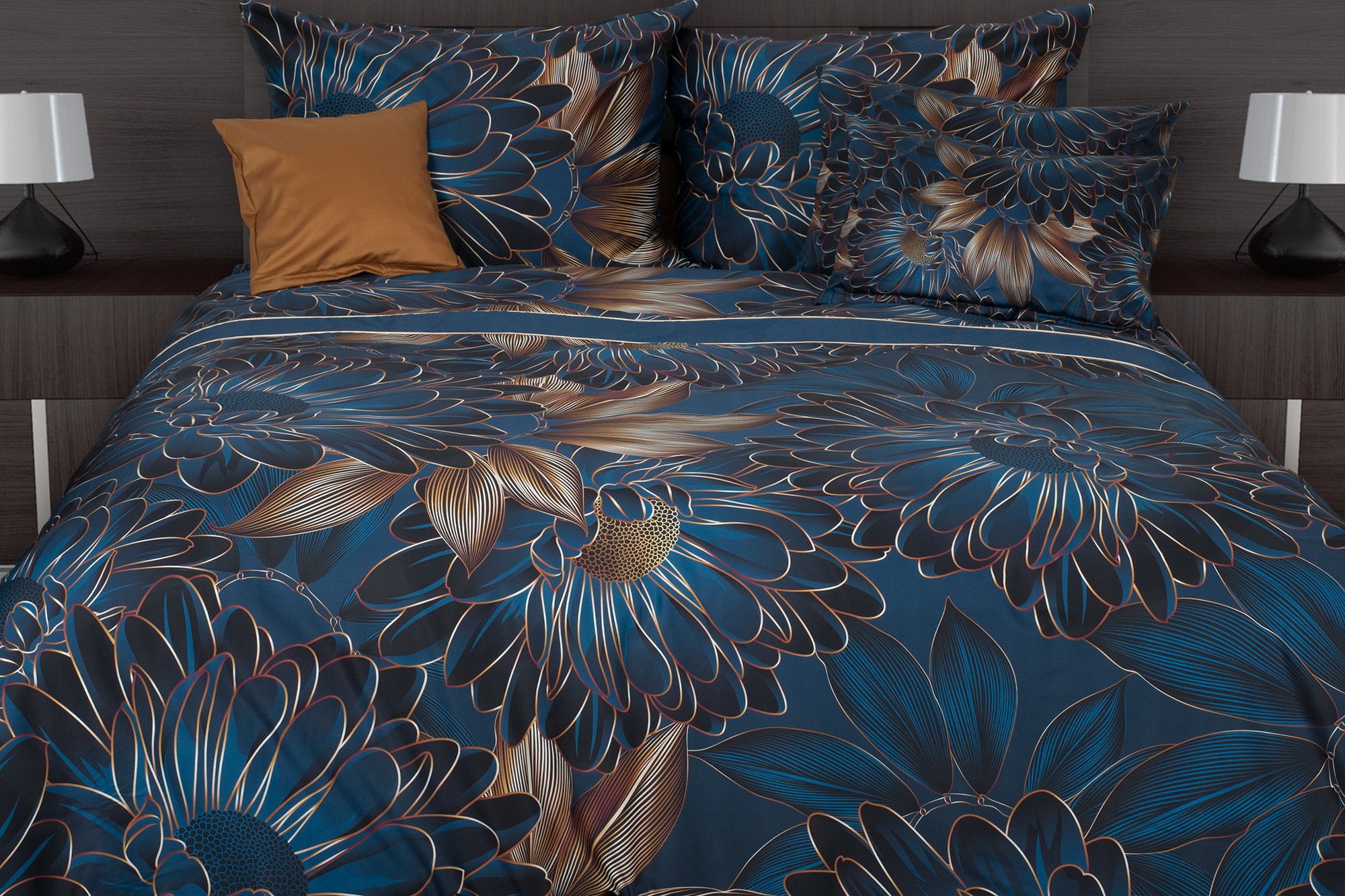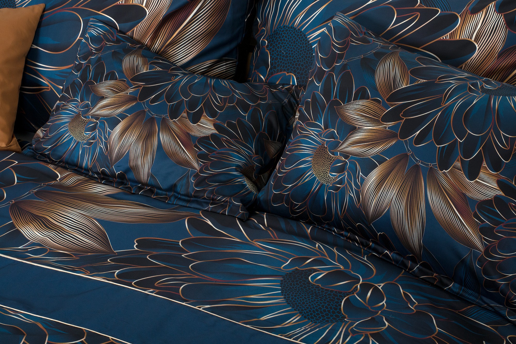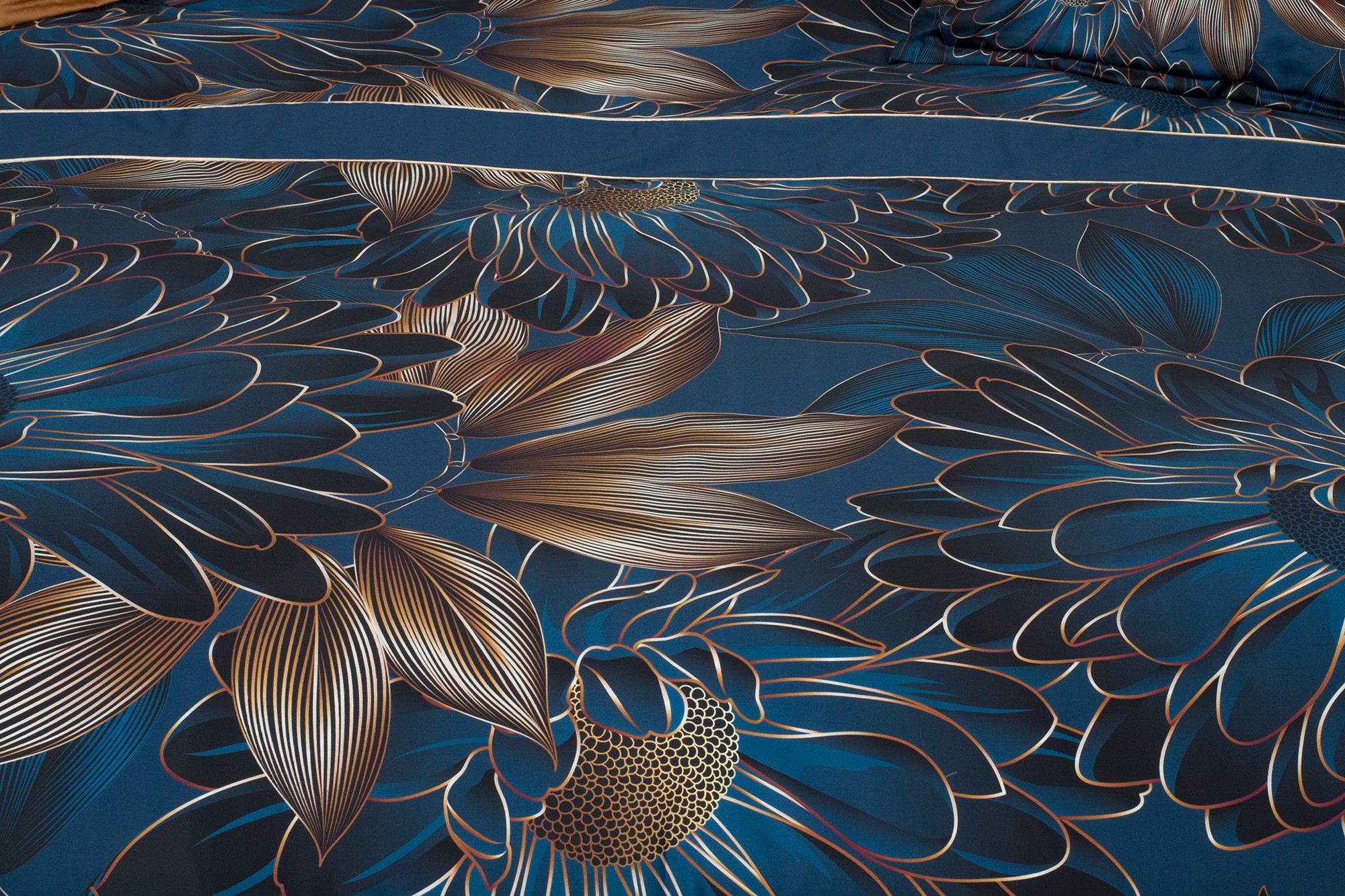Veľké abstraktne poňaté kvety v tmavomodrej farbe dopĺňajú zlatavohnedé listy. Obliečky sú vyrobené z prémiového bavlneného saténu, ktorý je charakteristický svojim decentným leskom a veľmi jednoduchou údržbou.