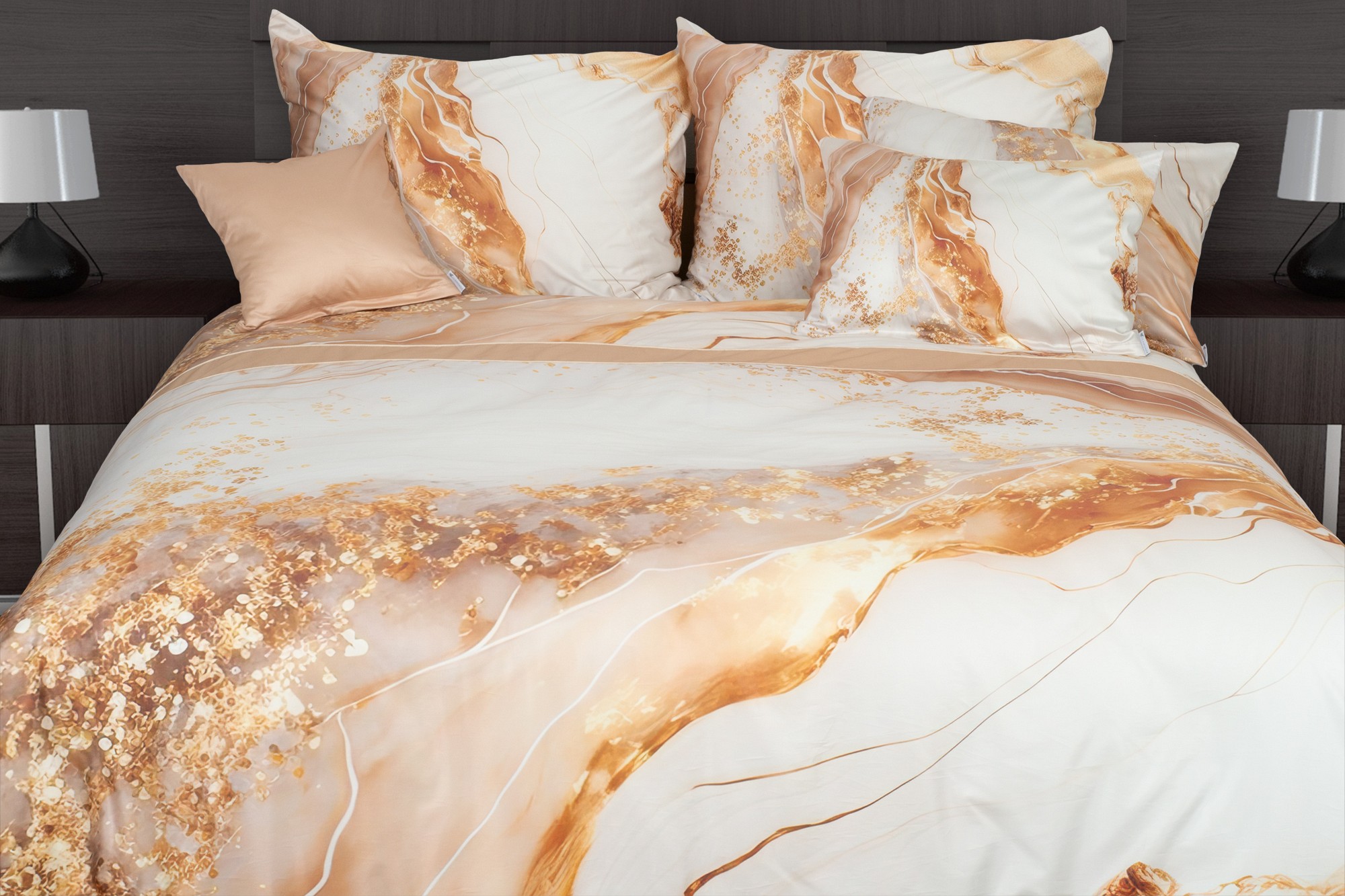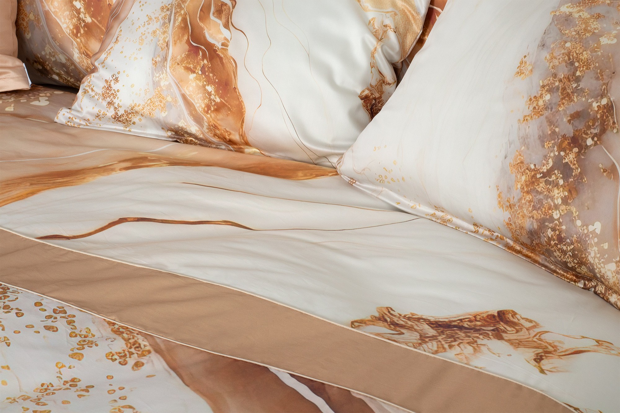 Luxusný mramorový vzor v odtieňoch hnedej so zlatými prvkami na smetanovo bielom podklade.